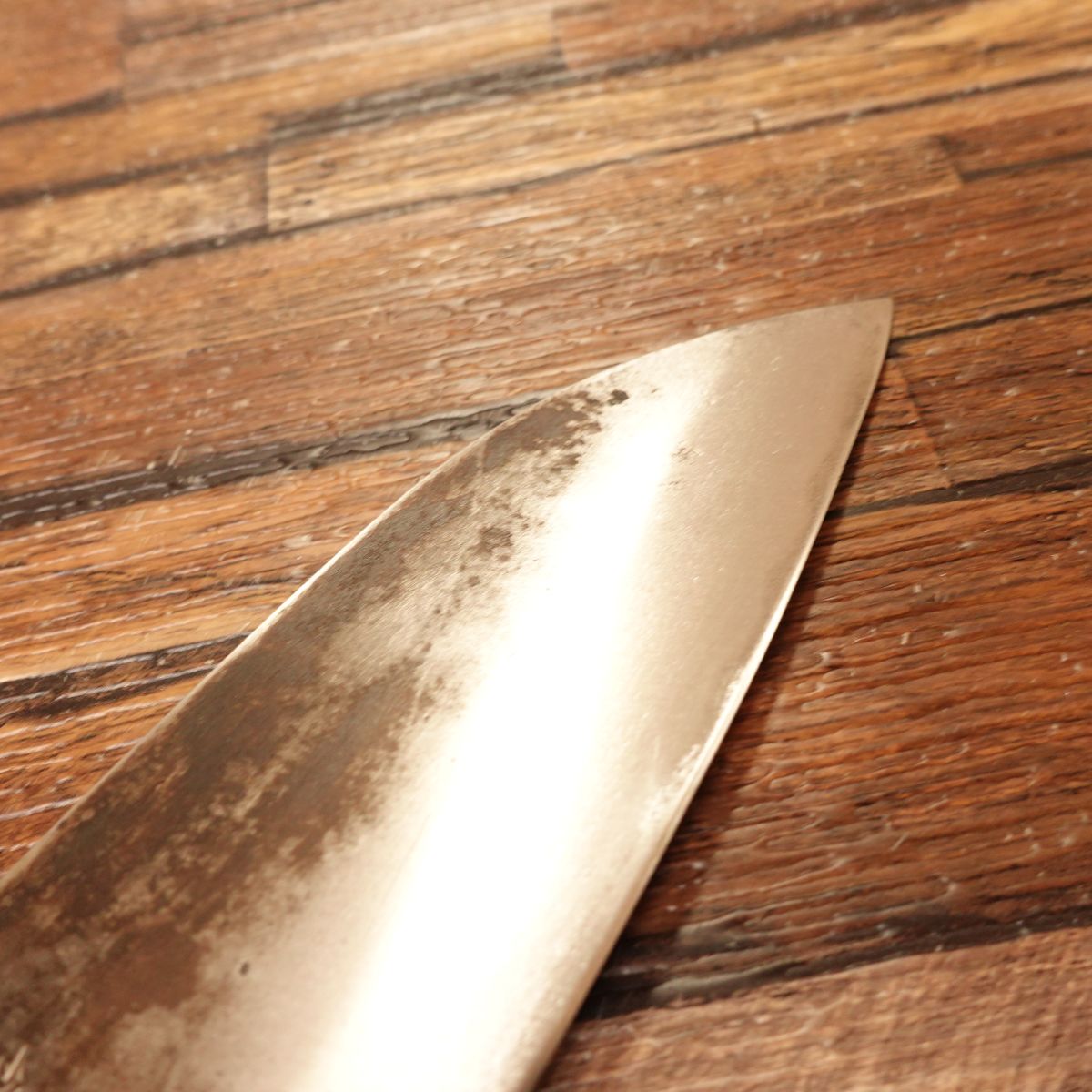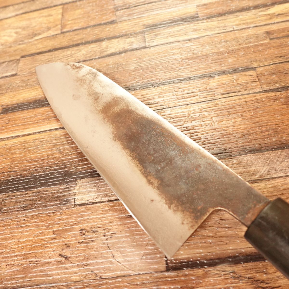 This is a santoku knife from Echigo Ittetsu. The santoku is a versatile all-purpose knife that comfortably handles meat, fish, and vegetables, and its shape is easy to use in the home kitchen. The spine is thicker near the heel and tapers thinner toward the tip. Some of the original kurouchi finish has thinned with maintenance, but overall the knife has been well stored and remains in good condition.