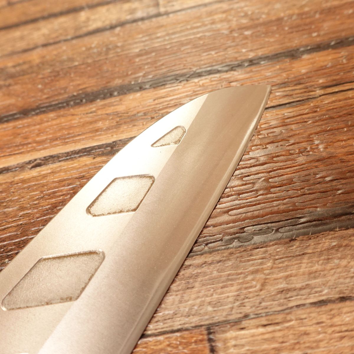 This is a Titan21 santoku knife. The santoku is a convenient all-purpose knife for daily cooking, handling meat, fish, and vegetables. Made from a titanium hybrid alloy, this knife is not just rust-resistant but effectively rust-free. It is very thin and light, making it extremely easy to maneuver.