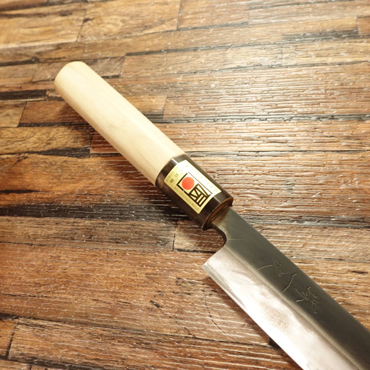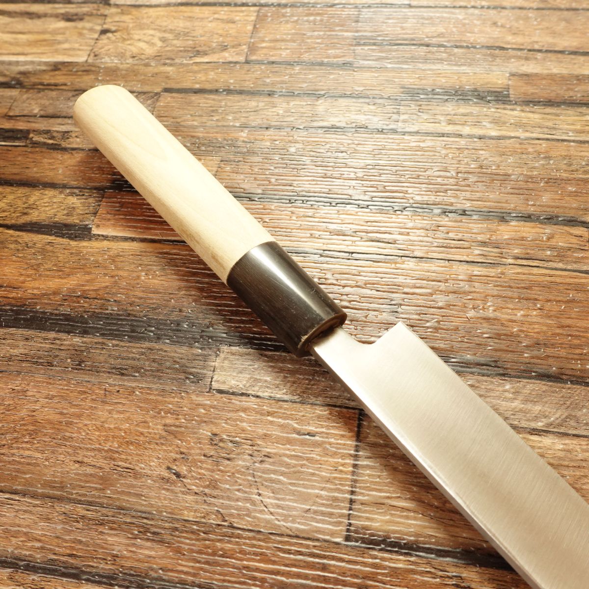 This knife is single-beveled and made of hagane (high-carbon steel). It is an unused stored item, but because it was stored, it has been sharpened and serviced. It should be an easy way to enjoy sashimi from fish blocks at home. Please note there may be minor storage marks and sharpening marks.