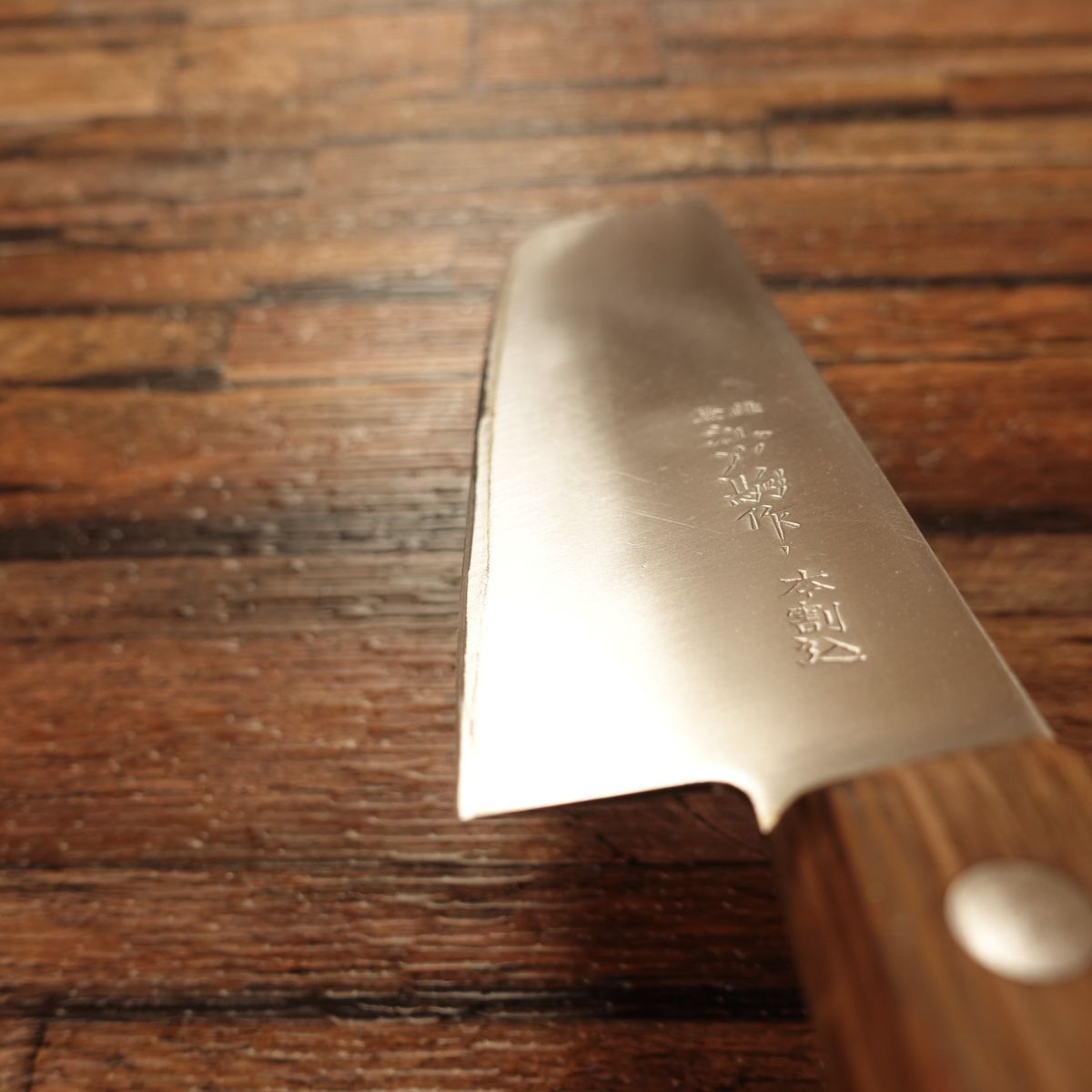 This knife is double-beveled with a warikomi (clad) construction, with hagane as the core. It offers excellent cutting performance and is relatively easy to care for, but since the edge is carbon steel, please wipe moisture frequently during use.