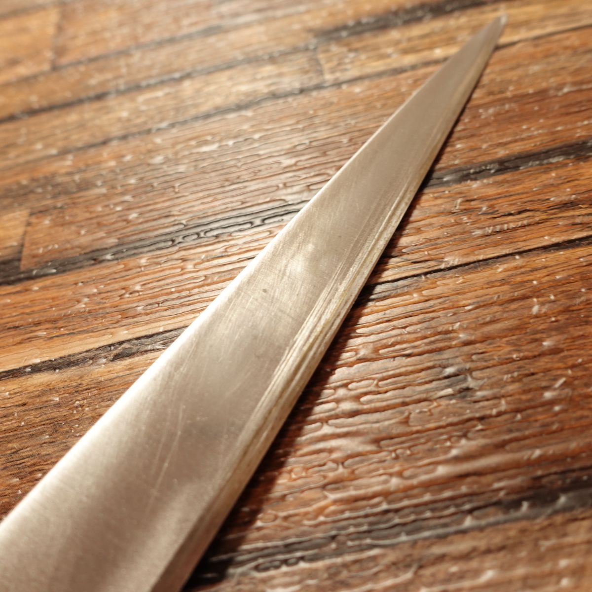 The Sujihiki features a slim blade ideal for cleanly slicing meat. It had been maintained with a single-bevel style edge and has been finished accordingly. As it has been sharpened and maintained over time, sharpening marks extend close to the heel area. This is reflected in the price, making it a good opportunity for those seeking value.