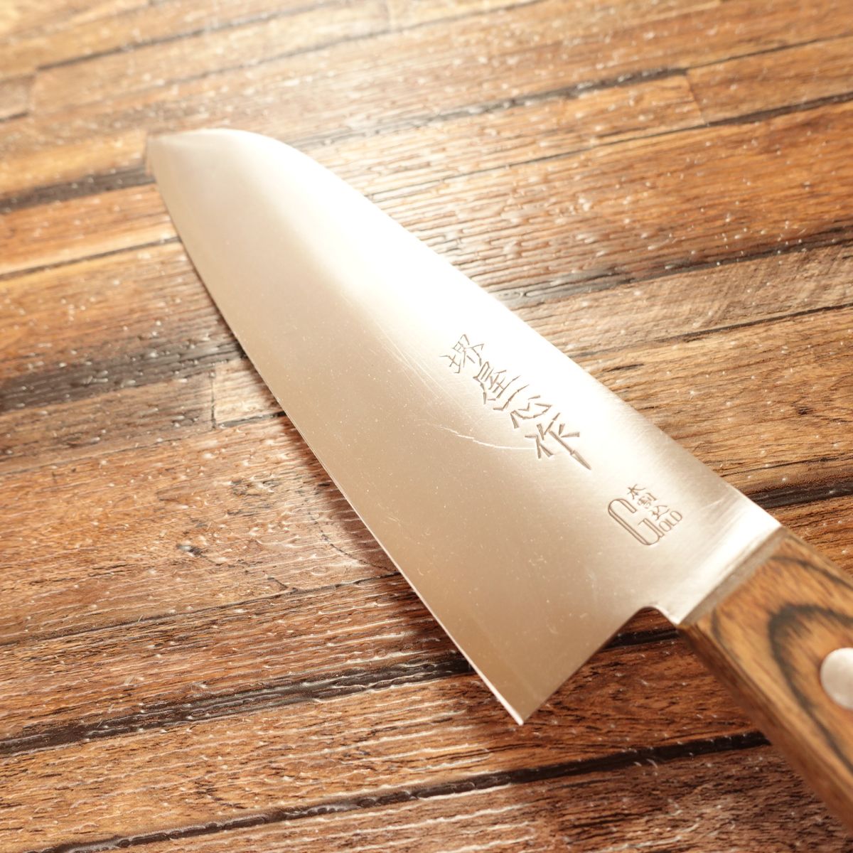 The Santoku is a convenient all-purpose knife for everyday use. This item shows extremely minimal signs of use and appears to have been rarely used. It offers both rust resistance and good cutting performance.