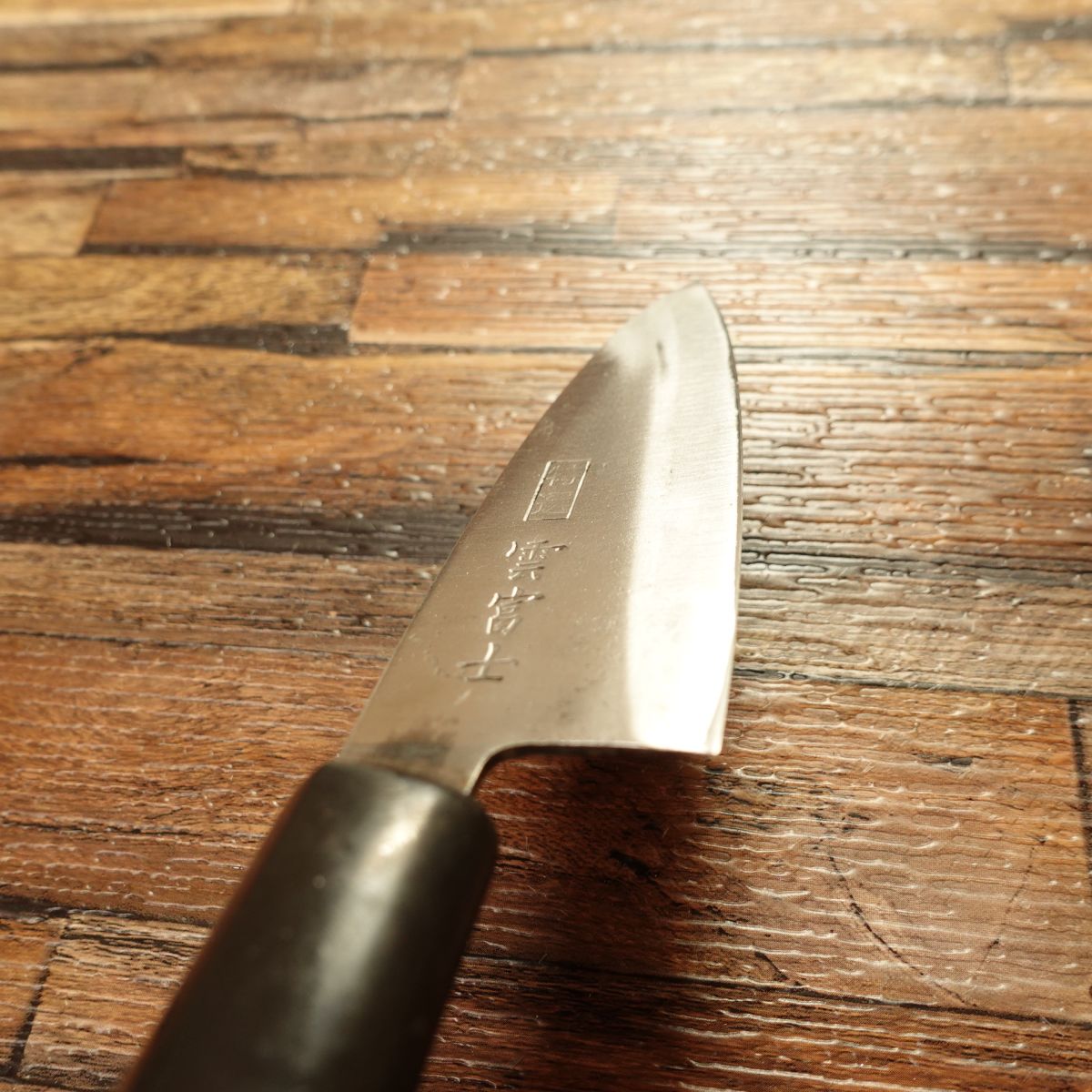 This knife is double-beveled and made of hagane (high-carbon steel). It is a double-bevel aji-kiri that still has plenty of life left and is ready to be put back to work.
