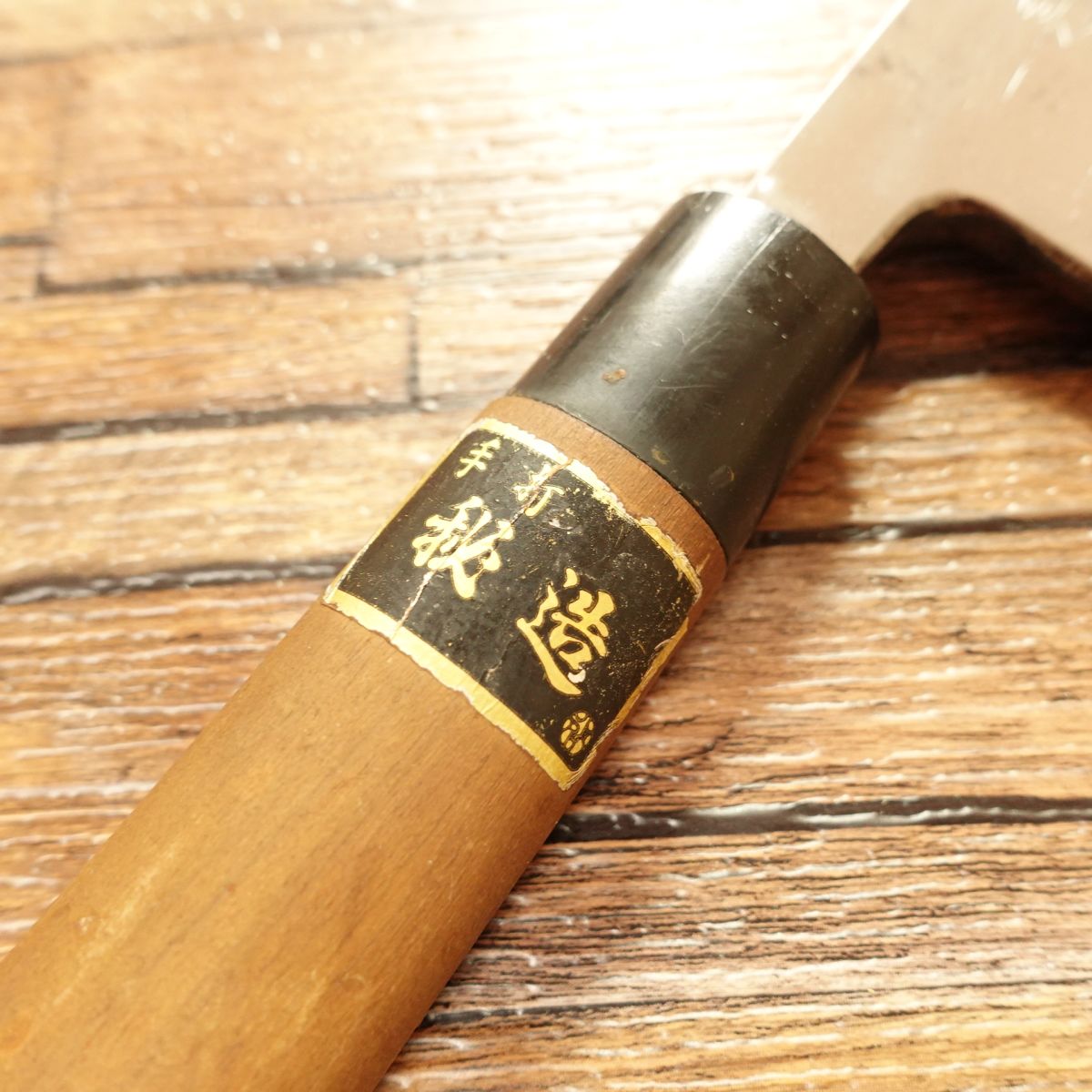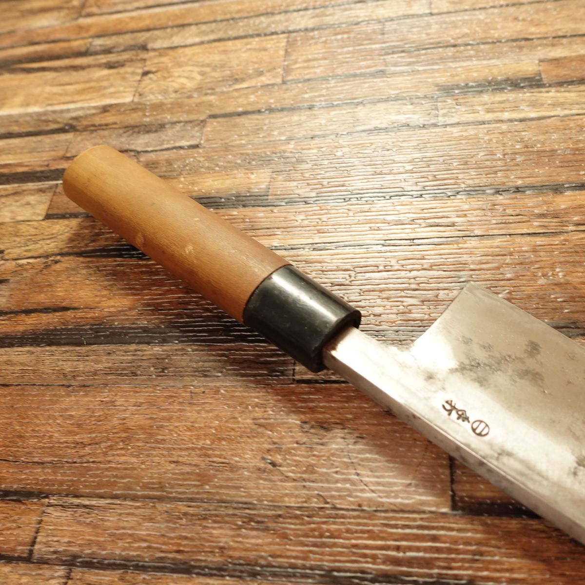 This knife is single-beveled and made of hagane (high-carbon steel). The sticker remains and it shows little sign of use, though there is some darkening likely from storage. The sharpened edge shows a clean silver hagane surface.
