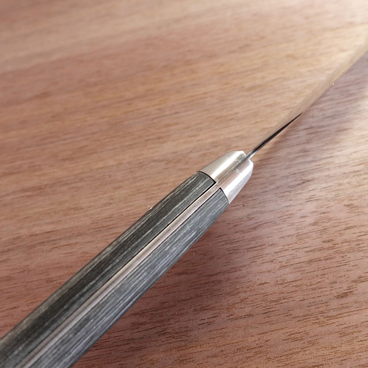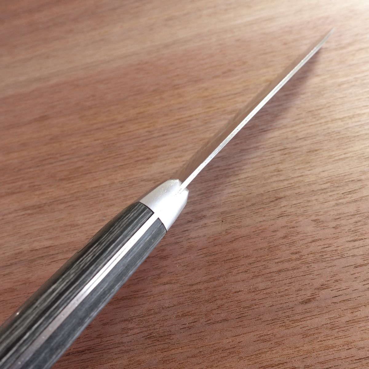 The Santoku is a versatile knife widely used for preparing meat, fish, and vegetables. This piece is from the trusted Kai brand. There are some small dark spots on the carbon steel edge area, but they should not affect use and can be managed through regular sharpening. The laminated construction offers good sharpness and handling.