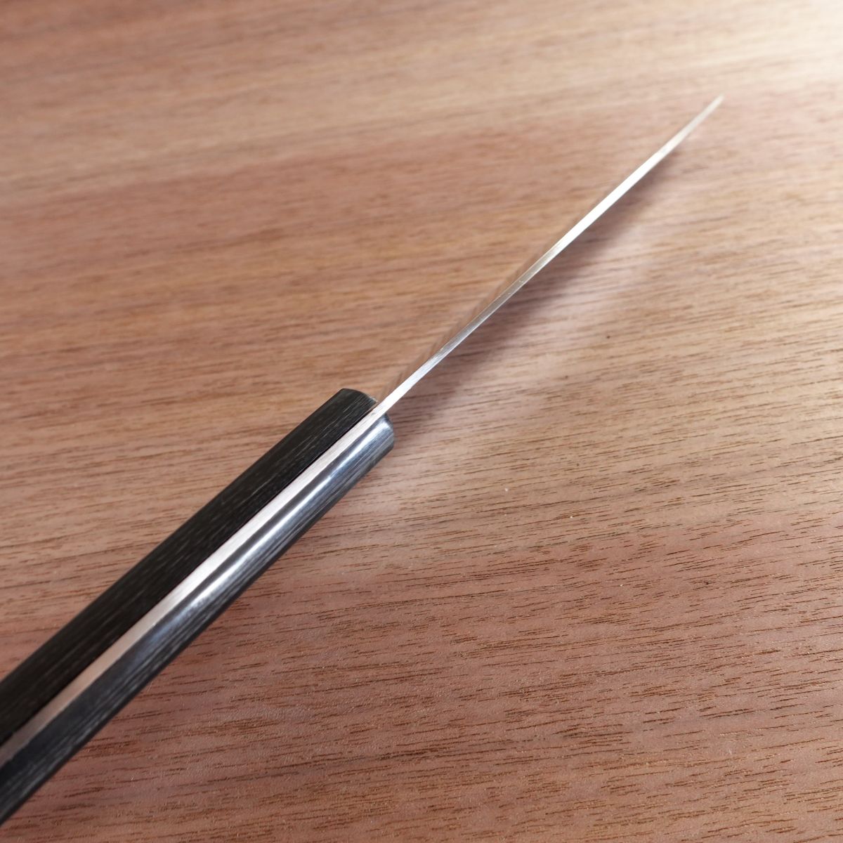 The Santoku is a versatile all-purpose knife widely used for preparing meat, fish, and vegetables. This is an unused stored item, and we did not sharpen it to avoid adding sharpening marks. Please allow for storage dirt or small scratches.